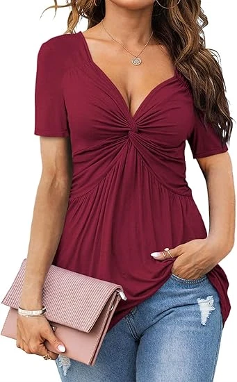 Womens Front Knotted V-Neck Blouse T Shirt