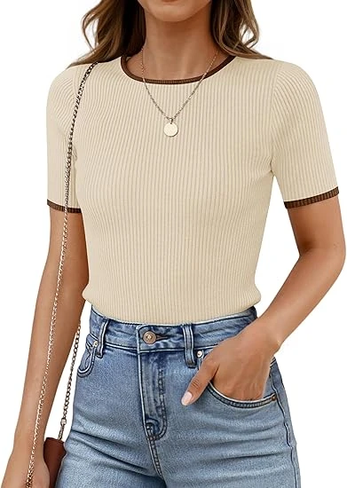 Women's Summer Short Sleeve Ribbed Knit Slim Fit T Shirt